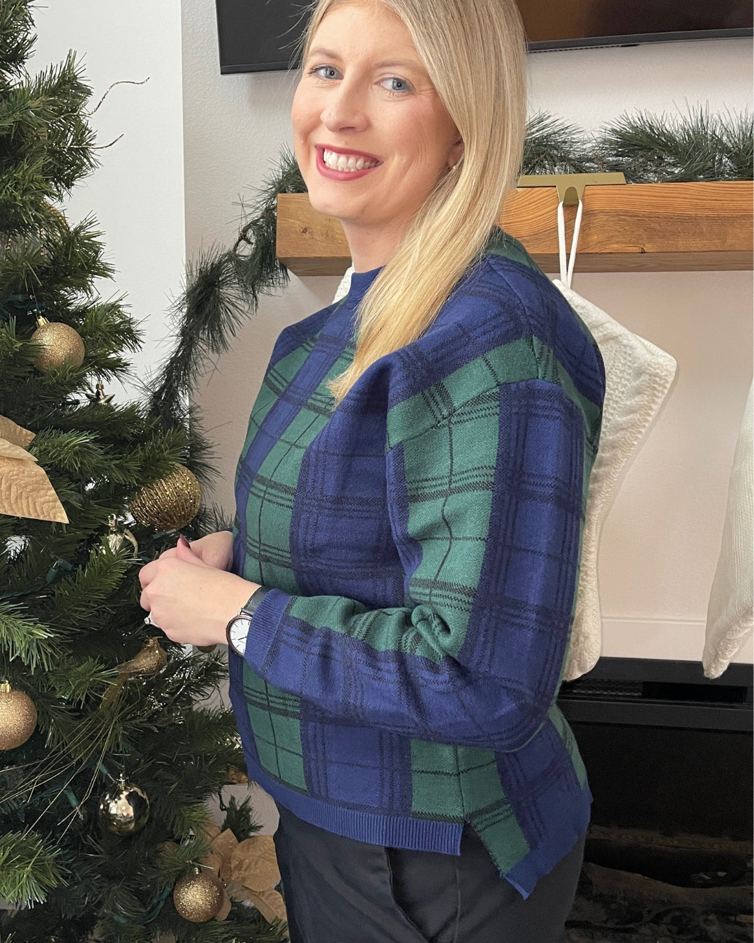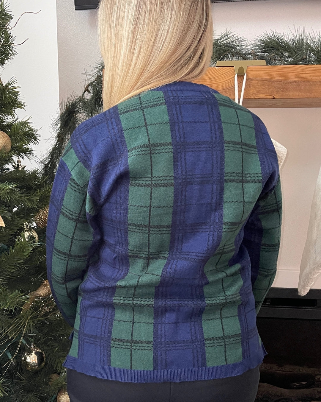 • Load image into Gallery viewer, Woman wearing a blue and green plaid sweater standing in front of a decorated Christmas tree.