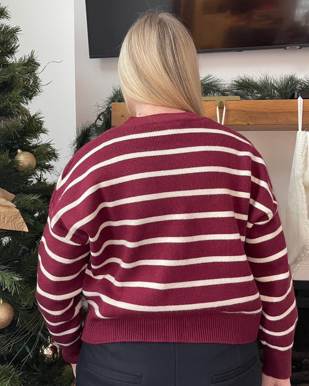 Add some playful flair to your work wardrobe with our Ruby Sweater! This burgundy and white striped cropped sweater is perfect for the office (and happy hour after). CPCC would recommend sizing down in the Ruby.